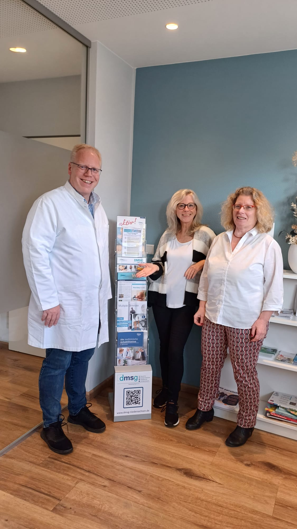 Heike Möbius (KG Lehrte) und Anja Grau (GF DMSG Niedersachsen) haben in der neurologischen Praxis Lehrte ein DMSG-Regal aufgestellt. Seit dem 23.10.25 ist das Wartezimmer mit wertvollen Informationen und Broschüren der DMSG rund um das Thema MS bestückt, so dass die Patienten direkt „beim Doc“ darauf zugreifen können. Ein Dankeschön gilt Herrn Kuhlgert (Neurologe und Praxisinhaber), der die Sichtbarkeit der DMSG damit unterstützt. Ein „Beweisfoto“ und der anschließende kurzweilige Plausch rundeten die Aktion herzlich ab. Quelle: WIR Niedersachsen 4-2025